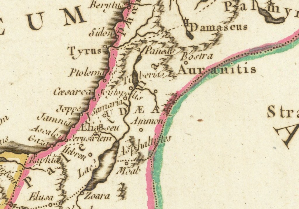 - PTOLOMEO, Claudio. Cosmographia. Siglo II. Imagen de una edición renacentista disponible en Wikimedia Commons, dominio público: https://es.m.wikipedia.org/wiki/Archivo:Oldest_surviving_Ptolemaic_map_of_Palestine,_from_Ptolemy%27s_fourth_map_of_Asia.png ↩︎