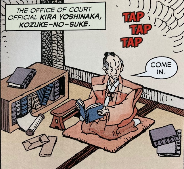 El señor de la Torre de Ako (Asano) tiene que recibir a alguien importante y, para que todo salga bien, decide contratar a un maestro de ceremonias (Kotsuké no Suké), que impartiría, sin gracia, las instrucciones3. Este es un señor arrogante, que está siempre de mal humor y que trata bastante mal a todo el mundo.